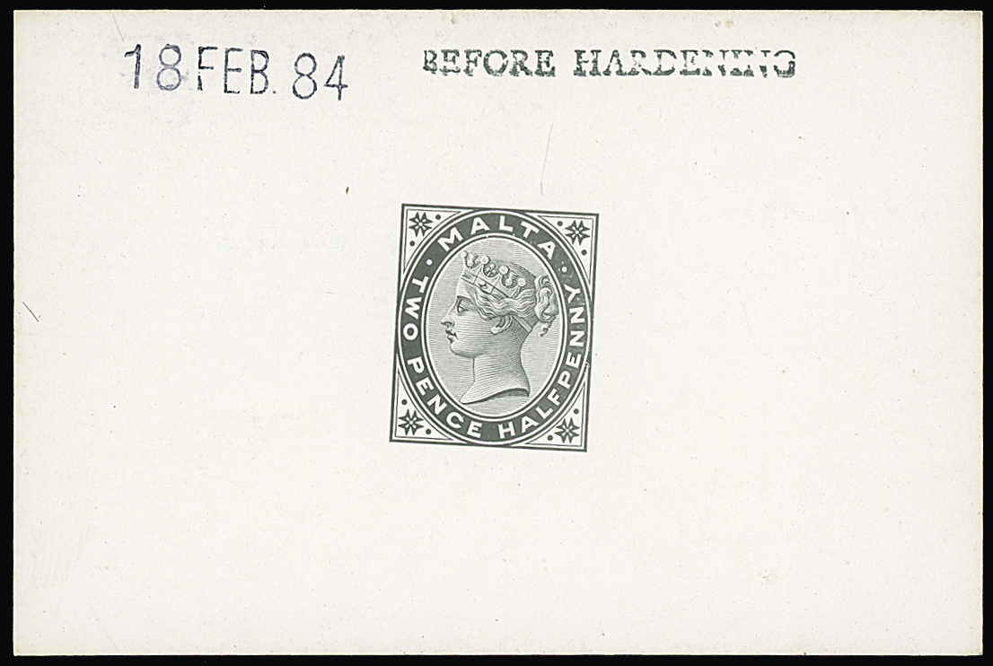 Malta: Issued Stamps: Queen Victoria: 1885-90, Proofs, 21/2d. die proof in black on glazed card (92 x 60mm), dated “18 FEB 84” and marked “BEFORE HARDENING”, fine. Photo. (Image1)