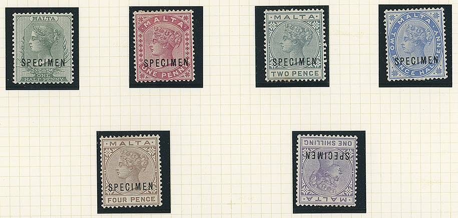 Malta: Issued Stamps: Queen Victoria: 1885-90 1/2d. to 1s. set of six all overprinted “SPECIMEN” 4d. without gum, some minor faults, a rare set. Ex Cann. S.G. 20s-30s, cat. £4,750. Photo. (Image1)