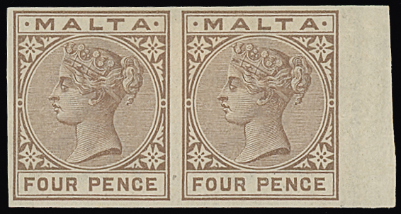 Malta: Issued Stamps: Queen Victoria: 1885-90 4d. brown imperf. pair, from the right of the sheet with gum, fine and rare. S.G. 27a, cat. £5,500. Photo. (Image1)