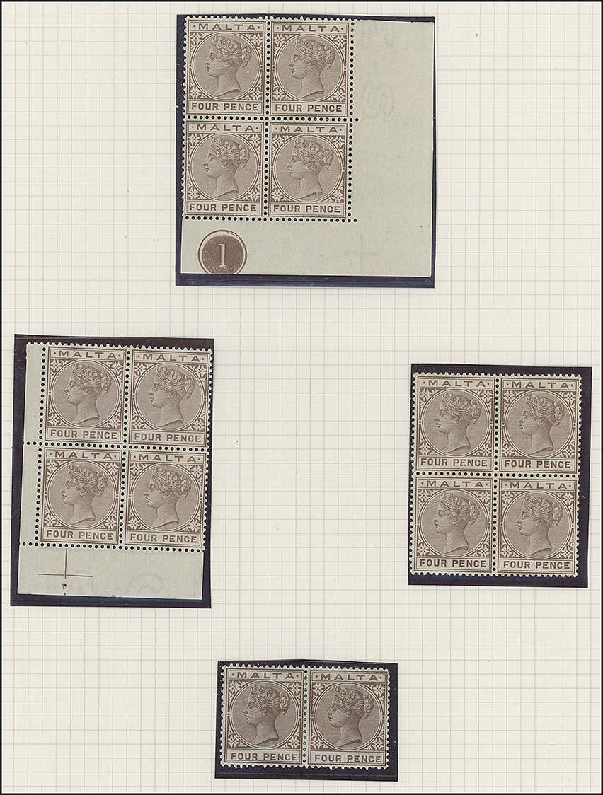 Malta: Issued Stamps: Queen Victoria: 1885-90 a mint collection on leaves, incl. values to 1s. with plate block of six, three blocks of four, four singles, shades, etc., varied condition. (135) (Image1)