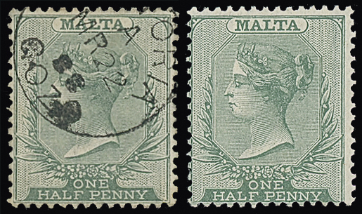 Malta: Issued Stamps: Queen Victoria: 1885-90 1/2d. green with inverted watermark a mint and used example, fine. S.G. 20, cat. £385. Photo. (Image1)
