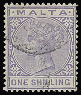 Malta: Issued Stamps: Queen Victoria: 1885-90 1s. pale violet with watermark inverted, used, slightly soiled, otherwise fine. S.G. 29w, cat. £350. Photo. (Image1)