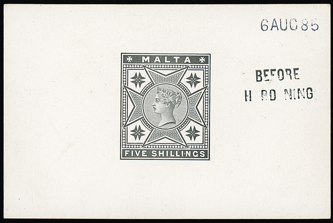 Malta: Issued Stamps: Queen Victoria: 1886 5s. die proof in black on glazed card (92 x 60mm), dated “6 AUG 85” and marked “BEFORE/HARDENING”, fine. Ex Orme (1965), Latto (1993). Photo. (Image1)