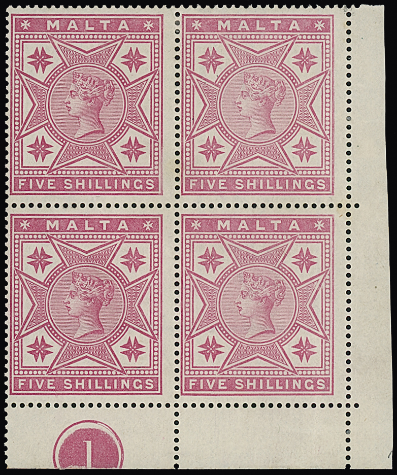 Malta: Issued Stamps: Queen Victoria: 1886 5s. rose mint block of four from the lower right corner of the sheet with plate number, minor gum crease, otherwise fine, lower pair is unmounted. S.G. 30. Photo. (Image1)