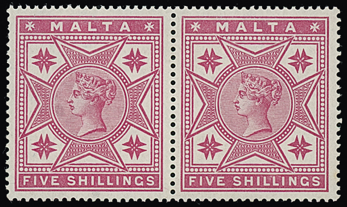 Malta: Issued Stamps: Queen Victoria: 1886 5s. rose with inverted watermark, in a fine unmounted mint horizontal pair. S.G. 30w, cat. £450+. Photo. (Image1)
