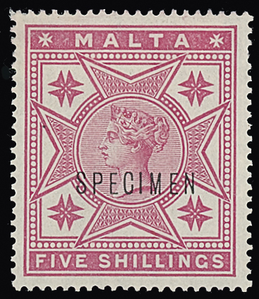 Malta: Issued Stamps: Queen Victoria: 1886 5s. rose with “SPECIMEN” overprint, fine with gum. S.G. 30s, cat. £1,000. Photo. (Image1)