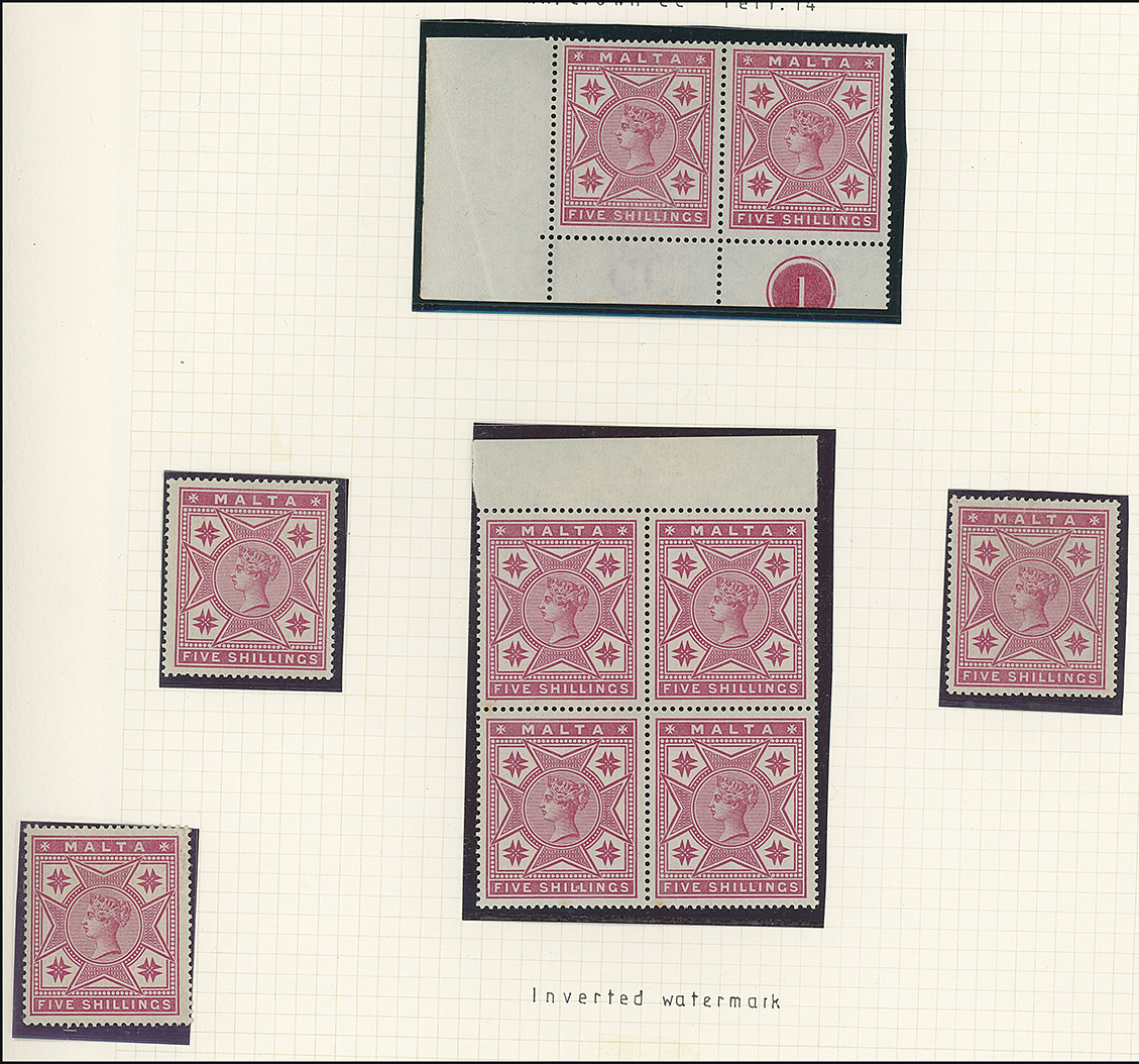 Malta: Issued Stamps: Queen Victoria: 1886 5s. rose block of four, plate number pair, three singles, mint, mainly fine. S.G. 30. Photo. (Image1)