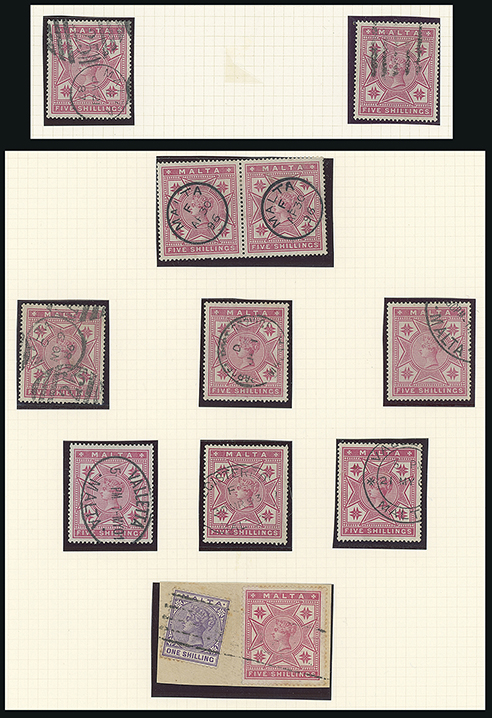 Malta: Issued Stamps: Queen Victoria: 1886 5s. rose, pair and nine singles used, also unused Sperati forgery, mainly fine. S.G. 30. (Image1)