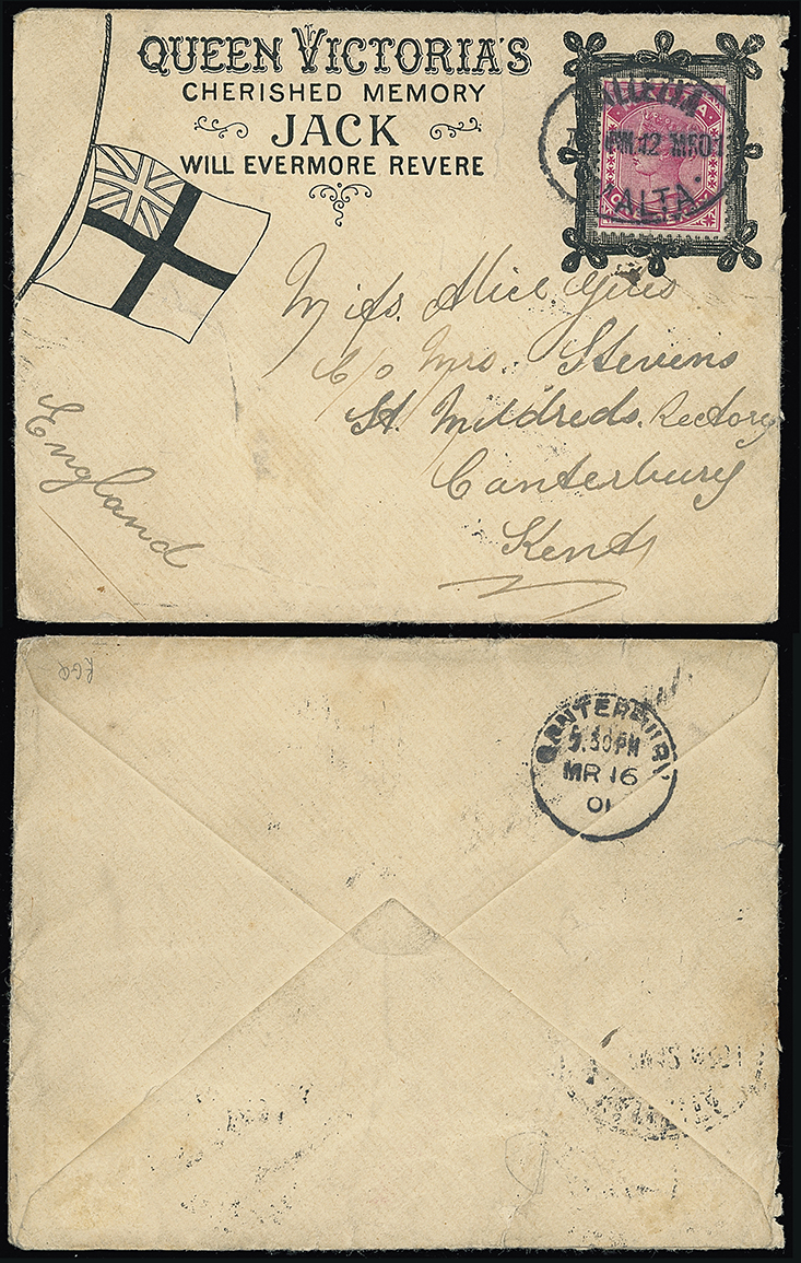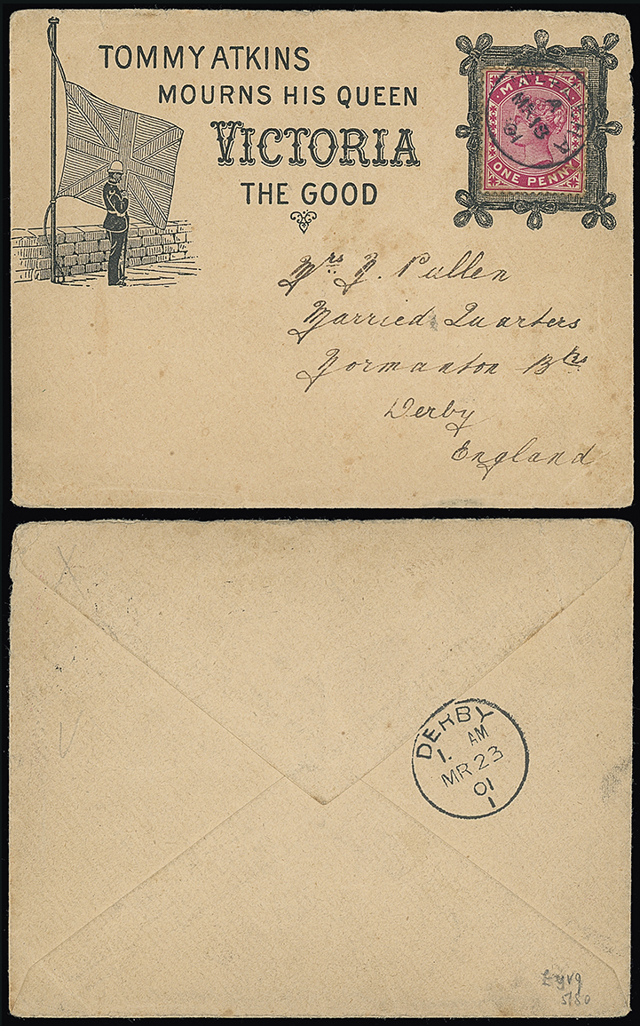 Malta: Issued Stamps: Queen Victoria: 1885-90 1d. carmine, fine used on printed “QUEEN VICTORIA’S/CHERISHED MEMORY/JACK/WILL EVERMORE REVERE”, stamp cancelled by oval “VALLETTA/MALTA” datestamp, addressed to