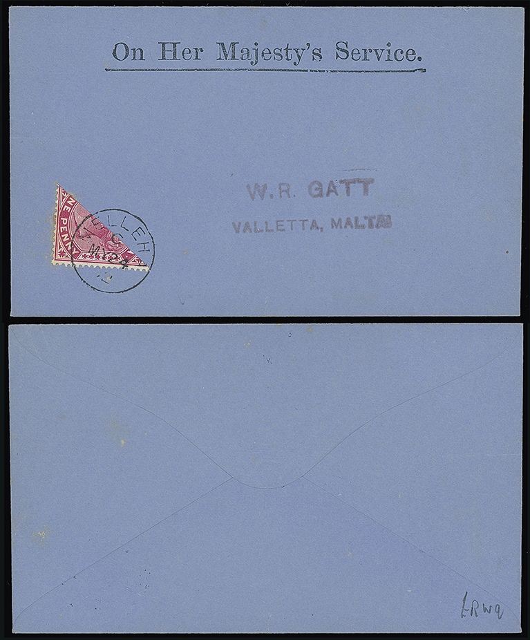 Malta: Issued Stamps: Queen Victoria: 1885-90 1d. carmine bisected and used on 1902 (May 24) O.H.M.S. cover, cancelled by the rarec Melleha code “C” cancel, fine and philatelic usage. Photo. (Image1)