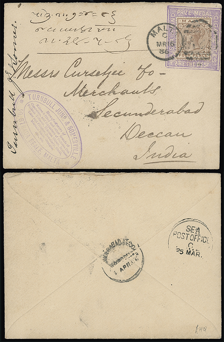 Malta: Issued Stamps: Queen Victoria: 1885-90 4d. brown used on 1886 (Mar. 16) Turnbull & Somerville advertising cover to India, showing “KAIDAR-I-HIND/CIGARETTES/ARE THE BEST”. Photo. (Image1)