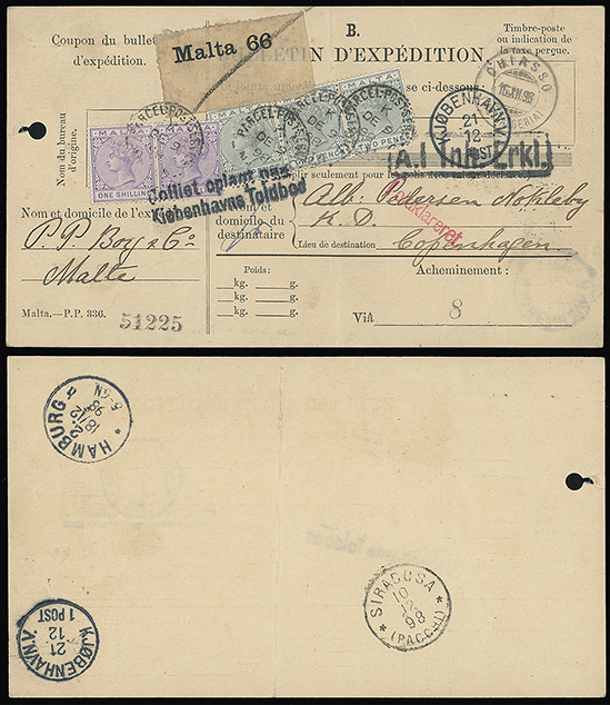 Malta: Issued Stamps: Queen Victoria: 1885-90 2d. (3) and 1s. (2) used on 1898 (Dec. 9) parcel card to Copenhagen, cancelled by Parcel Post Malta c.d.s’s. Photo. (Image1)