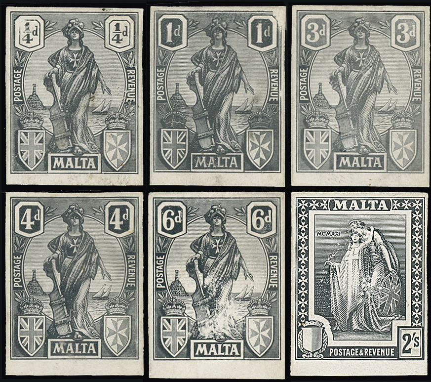 Malta: Issued Stamps: King George V: 1922-26 Melita, Proofs, 1/4d., 1d., 3d., 4d., 6d. and 2s. imperforate registration proofs printed in black on card. Letter from Richie Bodily in 1958 stating that these were