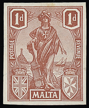 Malta: Issued Stamps: King George V: 1922-26 Melita, Colour Trials, 1d. imperforate colour trial in brown-red, the colour of the 11/2d., on watermarked paper. Photo. (Image1)