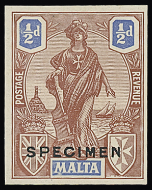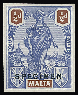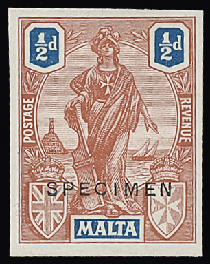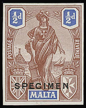 Malta: Issued Stamps: King George V: 1922-26 Melita, Colour Trials, 1/2d. imperforate colour trial in chestnut and blue, on unwatermarked paper, overprinted “SPECIMEN” (Samuel type DS1), fine. Photo. (Image1)