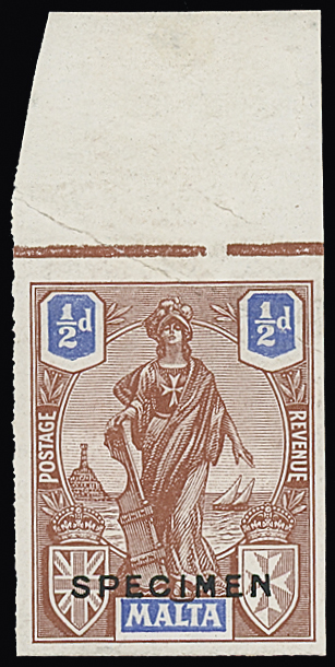 Malta: Issued Stamps: King George V: 1922-26 Melita, Colour Trials, 1/2d. imperforate colour trial in brown and blue from the top of the sheet, on unwatermarked paper, overprinted “SPECIMEN” (Samuel type DS1),