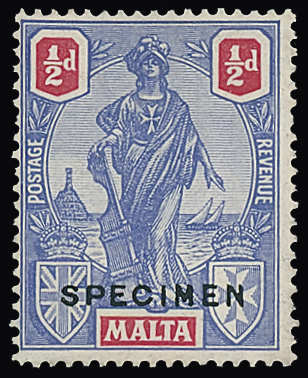 Malta: Issued Stamps: King George V: 1922-26 Melita, Colour Trials, 1/2d. perforated colour trial in blue and red, on unwatermarked paper, overprinted “SPECIMEN” (Samuel type DS1), fine. Photo. (Image1)
