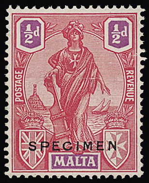 Malta: Issued Stamps: King George V: 1922-26 Melita, Colour Trials, 1/2d. perforated colour trial in red and purple, on unwatermarked paper, overprinted “SPECIMEN” (Samuel type DS1), fine. Photo. (Image1)