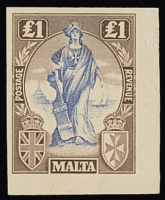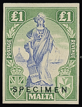 Malta: Issued Stamps: King George V: 1922-26 Melita, Colour Trials, £1 imperforate colour trial in blue and brown, on unwatermarked paper, diagonally overprinted “SPECIMEN”, fine and most attractive. Photo. (Image1)