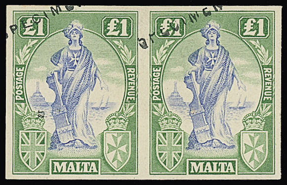 Malta: Issued Stamps: King George V: 1922-26 Melita, Colour Trials, £1 imperforate colour trial in green and blue, a pair on unwatermarked paper, diagonally overprinted “SPECIMEN” (Samuel type DS1), fine. Photo. (Image1)