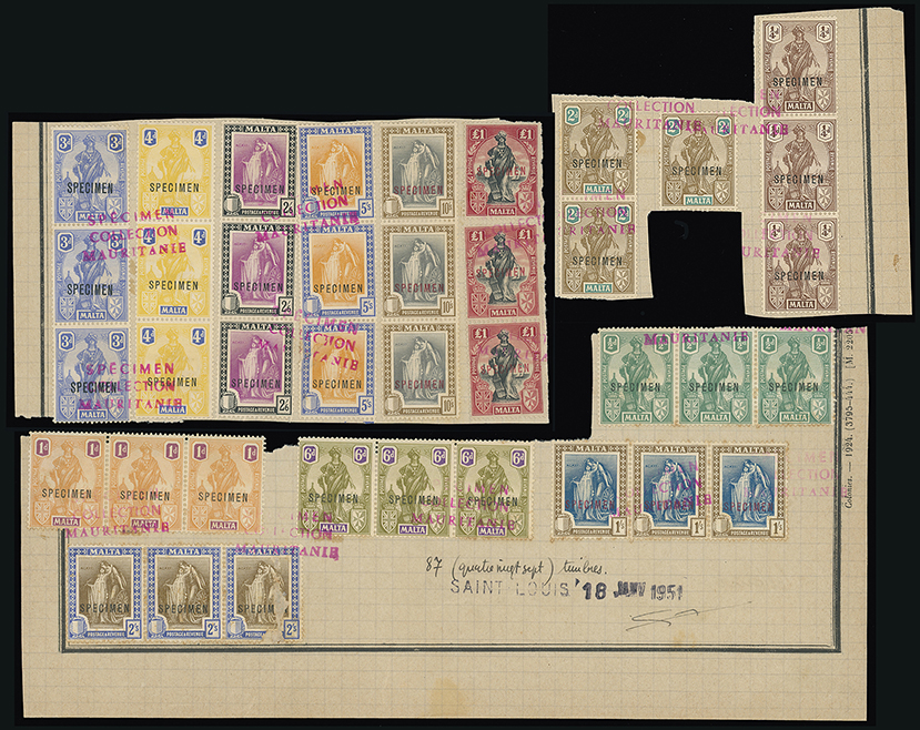 Mauritania Post Office, cancelled by three line “SPECIMEN/COLLECTION/MAURITANIE” in red, a few faults, otherwise fine and unique. Photo.