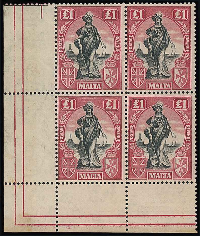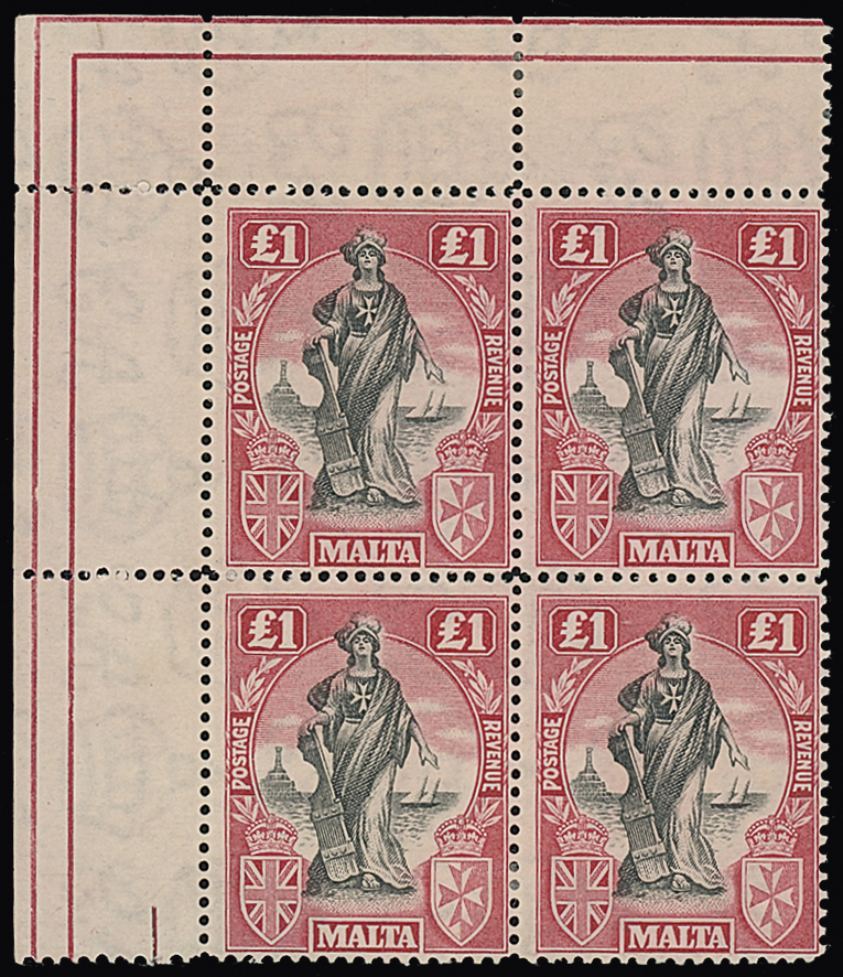 Malta: Issued Stamps: King George V: 1922-26 Melita, £1 black and bright carmine with watermark upright in a fine unmounted mint block of four from the lower-left corner of the sheet. S.G. 140, cat. £480+.
