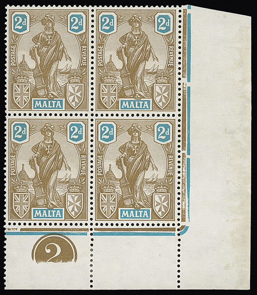 Malta: Issued Stamps: King George V: 1922-26 Melita, 2d. bistre-brown and turquoise in a fine unmounted mint block of four from the foot of the sheet with scarce plate number “2”. Nearly all stamps from plate 2