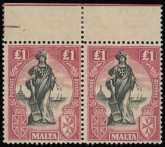 Malta: Issued Stamps: King George V: 1922-26 Melita, £1 black and bright carmine with watermark upright in a fine unmounted mint pair from the top of the sheet. S.G. 140, cat. £240+. Photo. (Image1)