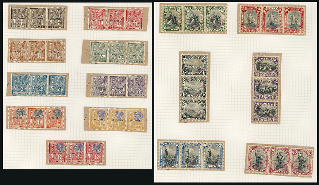 Malta: Issued Stamps: King George V: 1926-27 inscribed “POSTAGE”, 1/4d. to 10s. set (less 1/2d. and 5s.) in horizontal strips of three, overprinted “SPECIMEN”, all on pieces from a foreign postal administration,