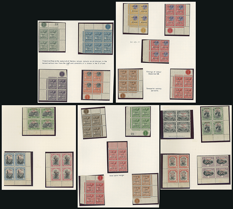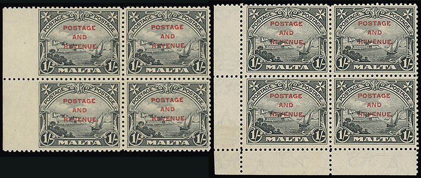 Malta: Issued Stamps: King George V: 1928 overprinted “POSTAGE/AND/REVENUE”, 1/4d. to 10s. set in mint blocks of four, extra 1d., 11/2d., and 6d., mainly fine. S.G. 174-192, cat. £800+. Photo. (Image1)