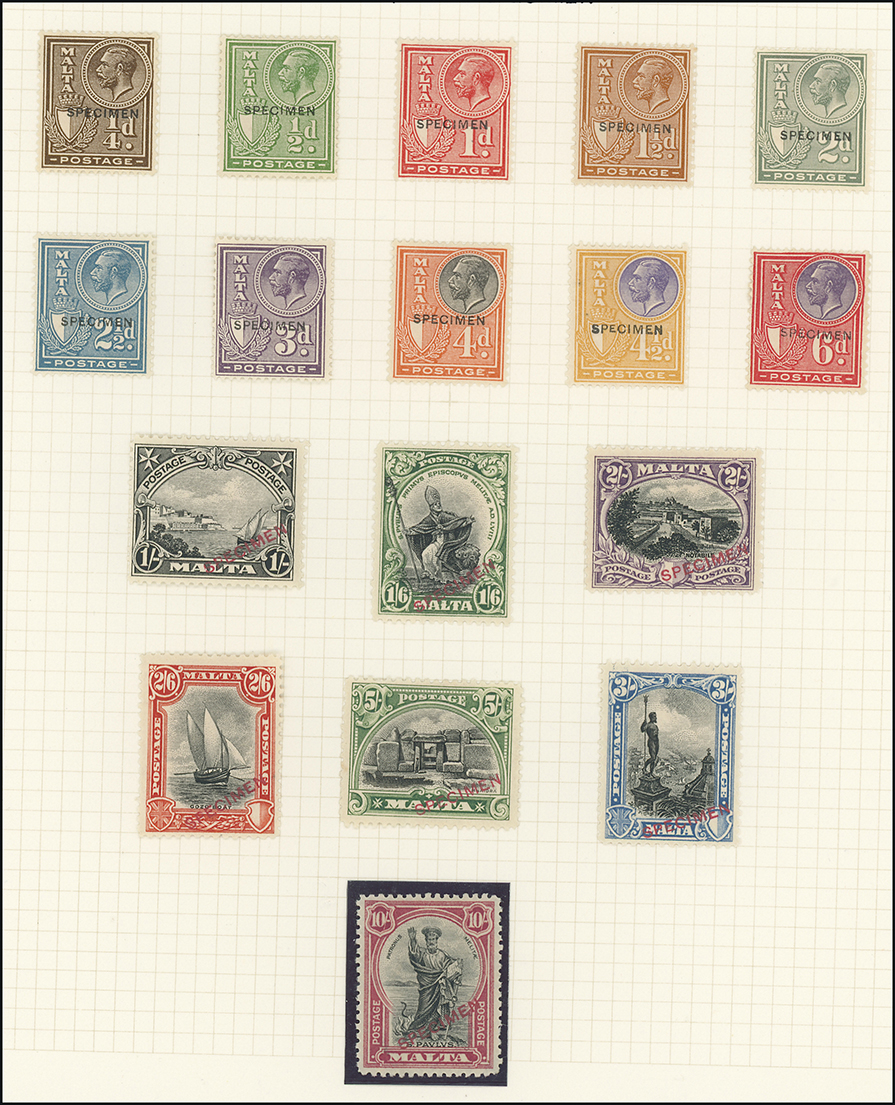 Malta: Issued Stamps: King George V: 1926-27 inscribed “POSTAGE”, 1/4d. to 10s. set overprinted “SPECIMEN”, mainly fine with with gum. S.G. 157s-172s, cat. £425. Photo. (Image1)