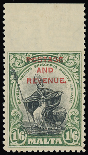 Malta: Issued Stamps: King George V: 1928 overprinted “POSTAGE/AND/REVENUE”, 1s.6d. single from the top of the sheet with variety imperforate between stamp and margin, unmounted mint, slightly toned, very rare.
