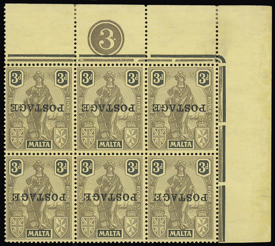 Malta: Issued Stamps: King George V: 1926 overprinted “POSTAGE”, 3d. black on yellow with variety overprint inverted, in a mint block of six (3 x 2) from the top-right corner of the sheet with plate no. “3”,