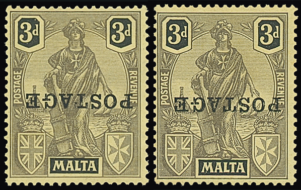 Malta: Issued Stamps: King George V: 1926 overprinted “POSTAGE”, 3d. black on yellow with variety overprint inverted, two mint examples, both with three pencil initials on gum, one has a few stain spots, otherwise