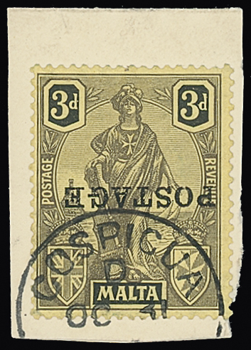Malta: Issued Stamps: King George V: 1926 overprinted “POSTAGE”, 3d. black on yellow with variety overprint inverted, used on piece, fine and scarce. B.P.A. certificate (1934). S.G. 149a, cat. £500. Photo. (Image1)
