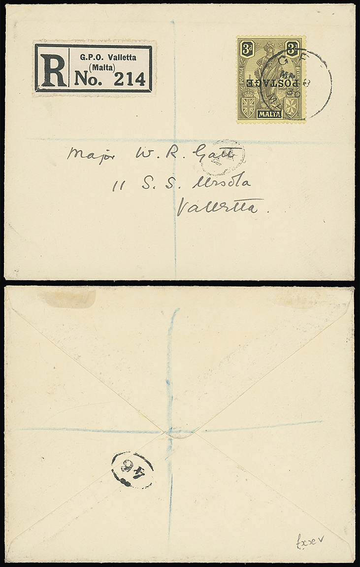 Malta: Issued Stamps: King George V: 1926 overprinted “POSTAGE”, 3d. black on yellow with variety overprint inverted, used on local registered cover addressed to W.R. Gatt, fine and scarce. Ex Coates. R.P.S.