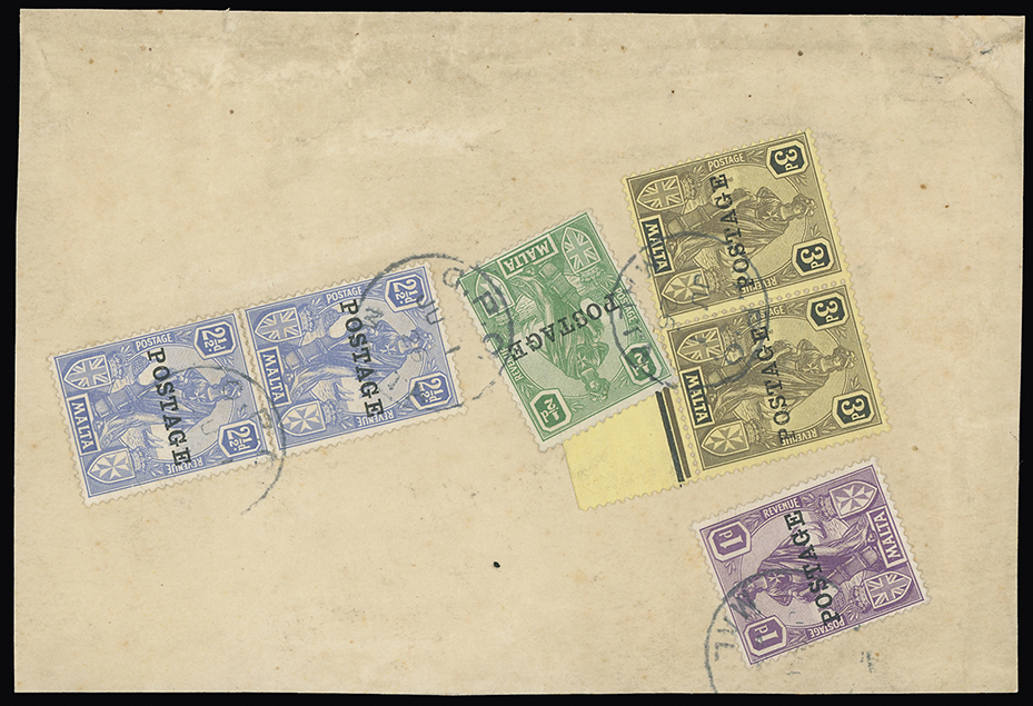 Malta: Issued Stamps: King George V: 1926 overprinted “POSTAGE”, 3d. black on yellow with variety overprint inverted a horizontal pair, used on large piece with normal 1/2d., 1d., 21/2d (2), fine and scarce