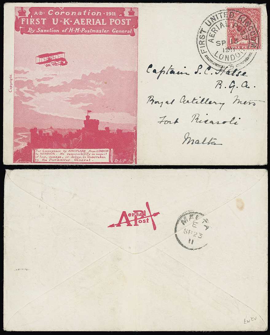 1217 c, entire, etc. imageMalta: Airmails: 1911 First U.K. Aerial Post: Sept. 15 London-Windsor red envelope, addressed to Malta, scarce overseas destination. Photo. (Image1)