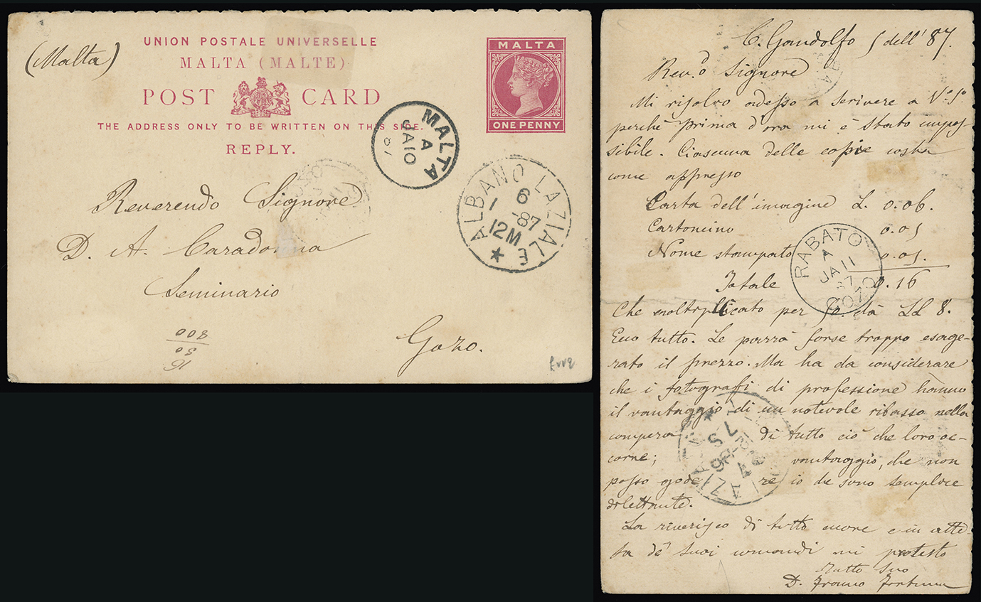 1212 c, entire, etc. imageMalta: Village Cancellations: Gozo: Rabato: 1887 (Jan. 18) incoming Malta 1d. reply postcard used from Italy, addressed to Rabato Gozo, with fine “RABATO/GOZO” datestamp on the reverse, card creased, otherwise fine. Photo. (Image1)