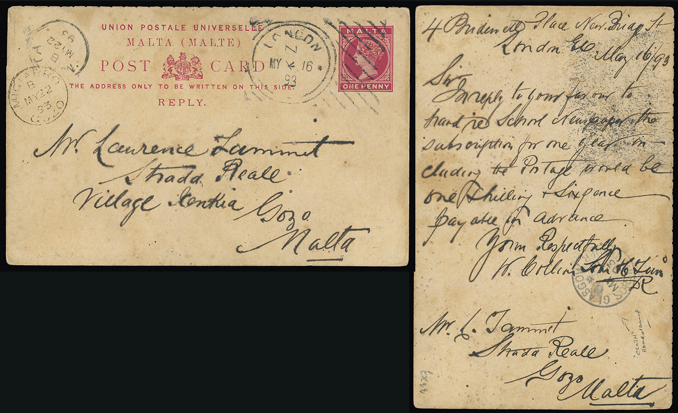 1214 c, entire, etc. imageMalta: Village Cancellations: Gozo: Xeuchia: 1893 (May 16) incoming Malta 1d. reply postcard used from London and addressed to Xeuchia, with Malta and Migiarro (type MG-1) datestamps, some soiling, otherwise fine. Photo. (Image1)