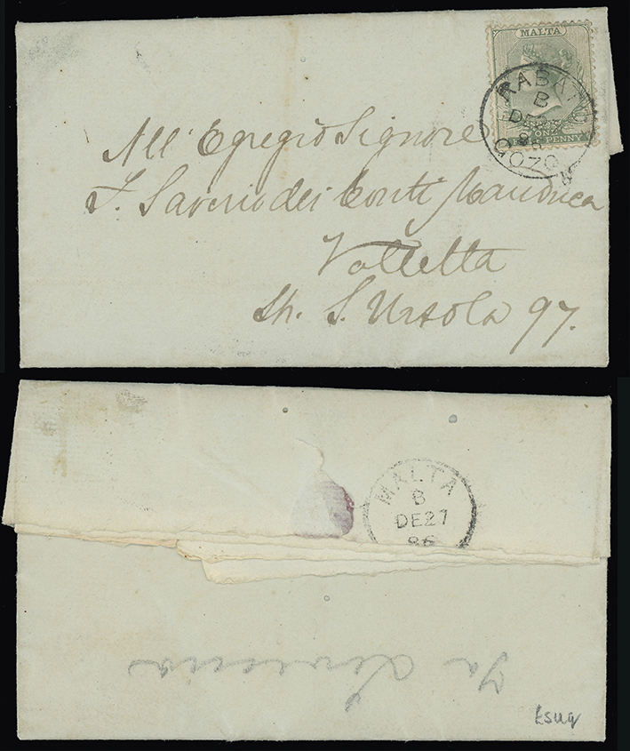 1211 c, entire, etc. imageMalta: Village Cancellations: Gozo: Rabato: 1886 (Dec. 27) entire to Valletta, franked by 1885-90 1/2d. green, tied by “RABATO/GOZO” c.d.s., scarce. Photo. (Image1)