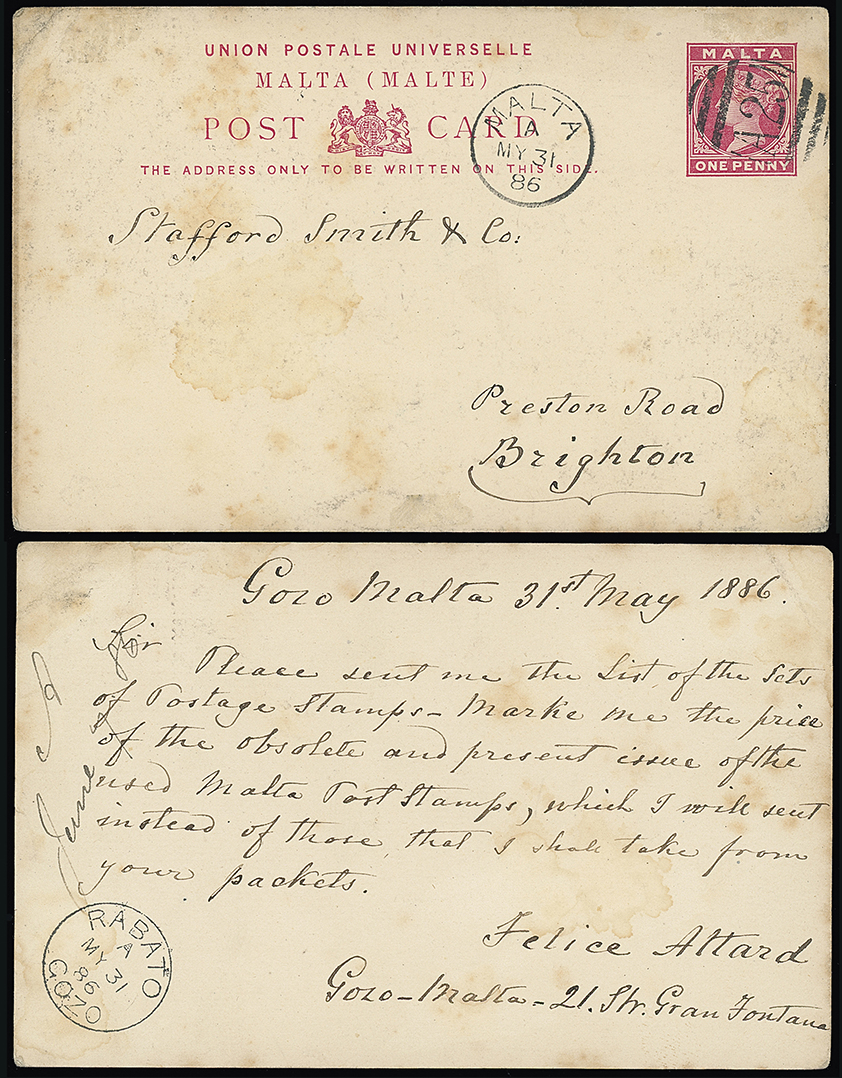 1210 c, entire, etc. imageMalta: Village Cancellations: Gozo: Rabato: 1886 (May 31) Q.V. 1d. stationery card to Brighton, cancelled by “A25” barred oval, with “RABATO/GOZO” c.d.s. on the reverse. This the earliest recorded use of this datestamp. Ex Eastgate. Photo. (Image1)