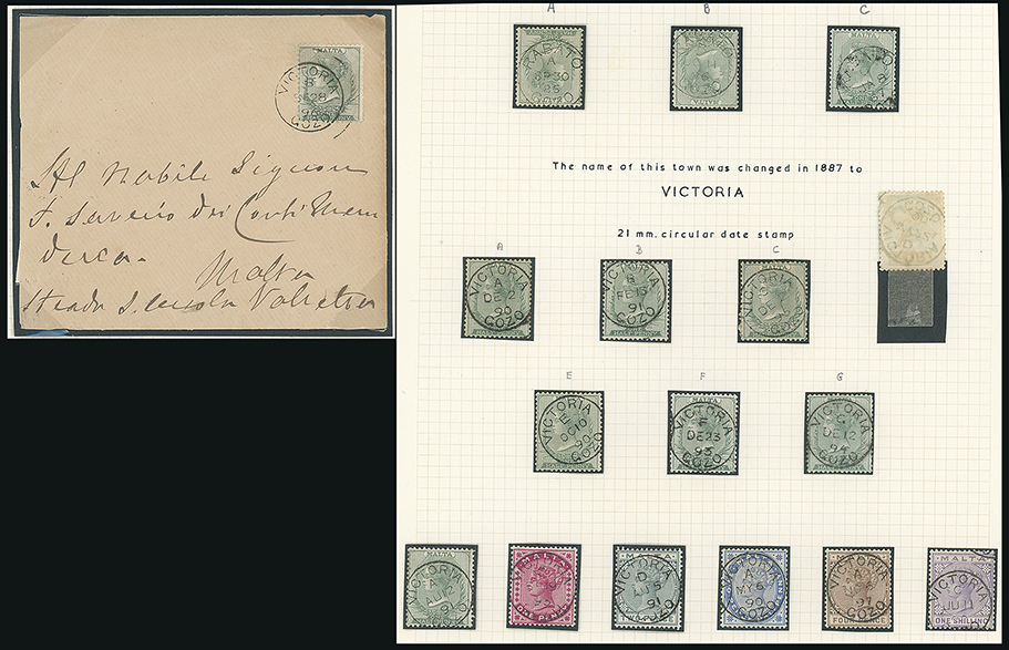 1213 Used imageMalta: Village Cancellations: Gozo: Victoria: 1889-1940 A collection of covers, cards and stamps on leaves, incl. postal stationery with 1910 2d. registration envelope size G used to Bavaria, bearing K.E.VII 21/2d., tied by Victoria c.d.s., etc. (16 items, 75 stamps) (Image1)