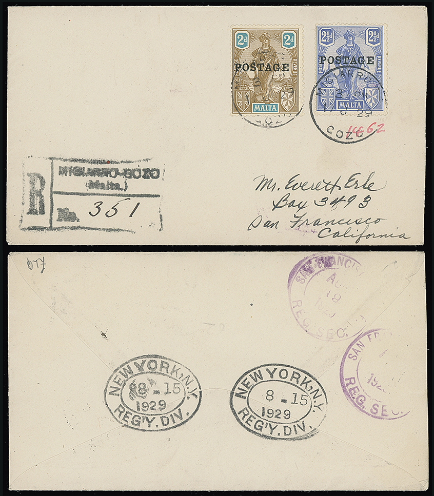 1205 c, entire, etc. imageMalta: Village Cancellations: Gozo: Migiarro: 1929 (July 17) cover, registered to U.S.A., franked by 1926 2d. and 21/2d., tied by “MIGIARRO/GOZO” c.d.s’s, bearing black boxed “R/MIGIARRO-GOZO/(Malta)” registration handstamp. The only recorded example of this registration handstamp. Photo. (Image1)