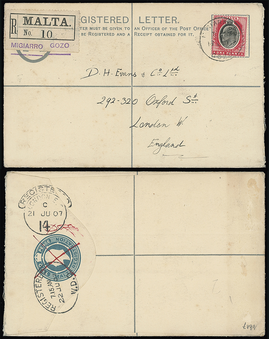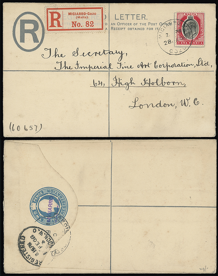 1204 c, entire, etc. imageMalta: Village Cancellations: Gozo: Migiarro: 1908 (Jan. 28) K.E.VII 2d. registration envelope size G, sent to London, franked by 1d. black and red tied by “MIGIARRO B.O/GOZO”, with violet “MIGIARRO” struck across the embossed stamp on the reverse, unusual. Photo. (Image1)