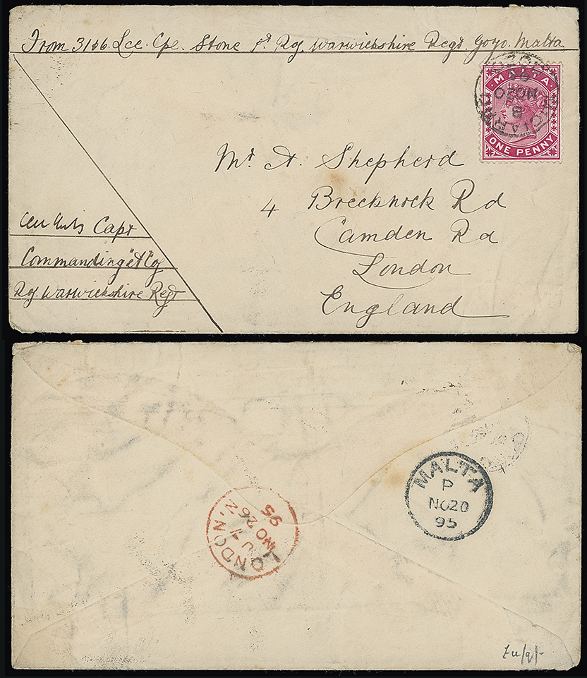 1201 c, entire, etc. imageMalta: Village Cancellations: Gozo: Migiarro: 1885 (Nov. 20) soldier’s cover to England, franked by 1d. carmine tied by “MIGIARRO/GOZO” c.d.s. (type MIG-1), manuscript “From Lce. Corpl. Stone of 1st. Royal Warwickshire, Regiment” and countersigned, rare concessionary rate from Gozo. Photo. (Image1)