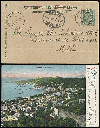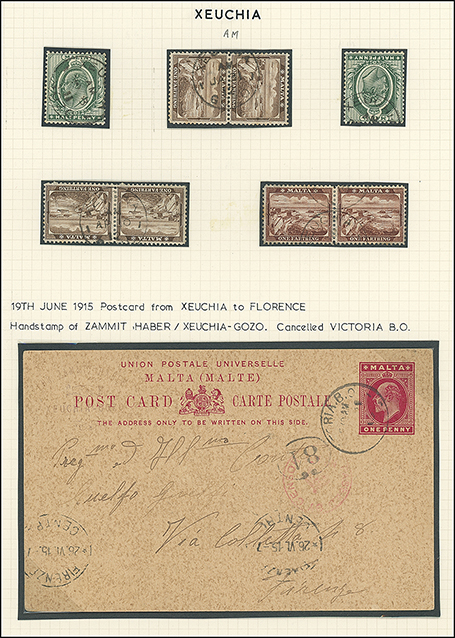 1215 c, entire, etc. imageMalta: Village Cancellations: Gozo: Xeuchia: 1915 1d. postal stationery card to Florence, cancelled by “VICTORIA B.O.” c.d.s., with faint violet handstamp of “ZAMMIT HABER/XEUCHIA-GOZO”, also 1899-1901 1/4d. pairs (3) and K.E.VII 1/2d. (2) with “XEUCHIA” c.d.s’s. (Image1)