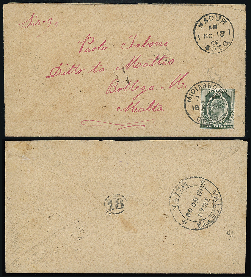 1208 c, entire, etc. imageMalta: Village Cancellations: Gozo: Nadur: 1909 (Nov. 18) cover bearing “NADUR/GOZO” c.d.s., franked by K.E.VII 1/2d. tied by “MIGIARRO/GOZO” c.d.s. with Valletta datestamp and postman’s “18” handstamp on the reverse. Photo. (Image1)