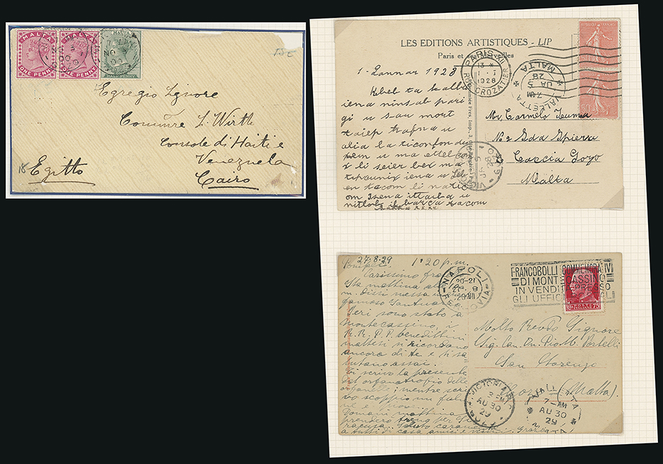 1218 c, entire, etc. imageMalta: Airmails: 1928 to 1959, a selection of covers and cards to outside Europe (excluding America and Africa), destinations with Australia, India, Malaysia 1933 (Dec. 5) cover to Singapore, franked by 1d. (2), 21/2d. (3) and 1s., etc. (35 items) (Image1)