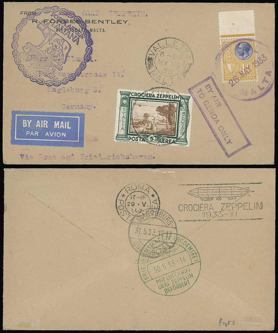 1222 c, entire, etc. imageMalta: Airmails: 1933 (May 26) acceptance for the Italian Zeppelin flight, cover to Magdeburg bearing Italy 4l. Zeppelin stamp, Italian cachet, also boxed “BY AIR/TO GENOA ONLY”, very rare. Photo. (Image1)